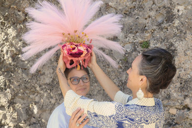 Estelle est carnettiste. Amoureuse des vieux papiers et des matériaux anciens qu’elle collecte précieusement, elle crée des carnets uniques où elle mêle illustrations, tissus et couture. Son bassin couronne fait non seulement écho au jaillissement d’une féminité assumée mais aussi à la joie enfantine et spontanée de créer. Estelle nous invite à regarder le monde sous un angle radicalement lumineux et à assumer nos nuances les plus éclatantes.